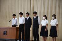続いて行われた後期生徒会役員任命式では、田口多佳史(会長)、一澤佑雅(副会長)、佐川瑛莉花(副会長)、三浦大空(書記)、河邉隆汰(書記)、富樫柊斗(会計)、小山悠人(会計)の各役員が選挙の結果任命されました。後期も学校行事が数多く計画されていますので、全校生徒で盛り上げてほしいと思います。