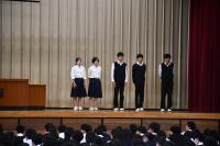 続いて行われた後期生徒会役員任命式では、西口音々(会長)、横須賀柊介(副会長)、鵜飼悠生(副会長)、福島椛綸(会計)、大橋隼(会計)の各役員が選挙の結果任命されました。後期も多くの学校行事が計画されていますので、生徒会役員を中心に各行事を全校生徒で盛り上げてほしいと思います。