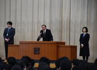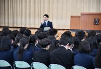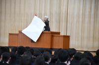 4月3日に「令和8年度離任式」が体育館で行われ、本校を去られた10名の先生方のうち、4名の先生が参加してくださいました。今瀬校長先生は、校歌に込められている主体性に触れ、「高い志をもって校歌を体現する人になってほしい、♪誠実(まこと)は永遠の力なり♪」と生徒を励ましてくださいました。「ちょっとでもできる自分を褒めて、0よりも何かを始めよう。」、「弱さや未熟さを力にして、生きることは物語を紡ぐこと。」、「何年たっても高校時代は大切な財産。」離任される先生方の言葉の一つ一つに緑高生への愛情が溢れていました。各先生方の新天地でのご活躍を祈念いたします。
