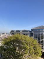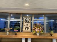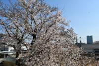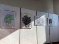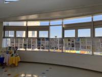 特別棟から中庭を見ると青い空の広がりに感動しました。1年生の廊下には、入学式でいただいた祝電が飾られていて生徒を見守っています。そして、美術部や華道部の作品が学校に彩りを添えています。