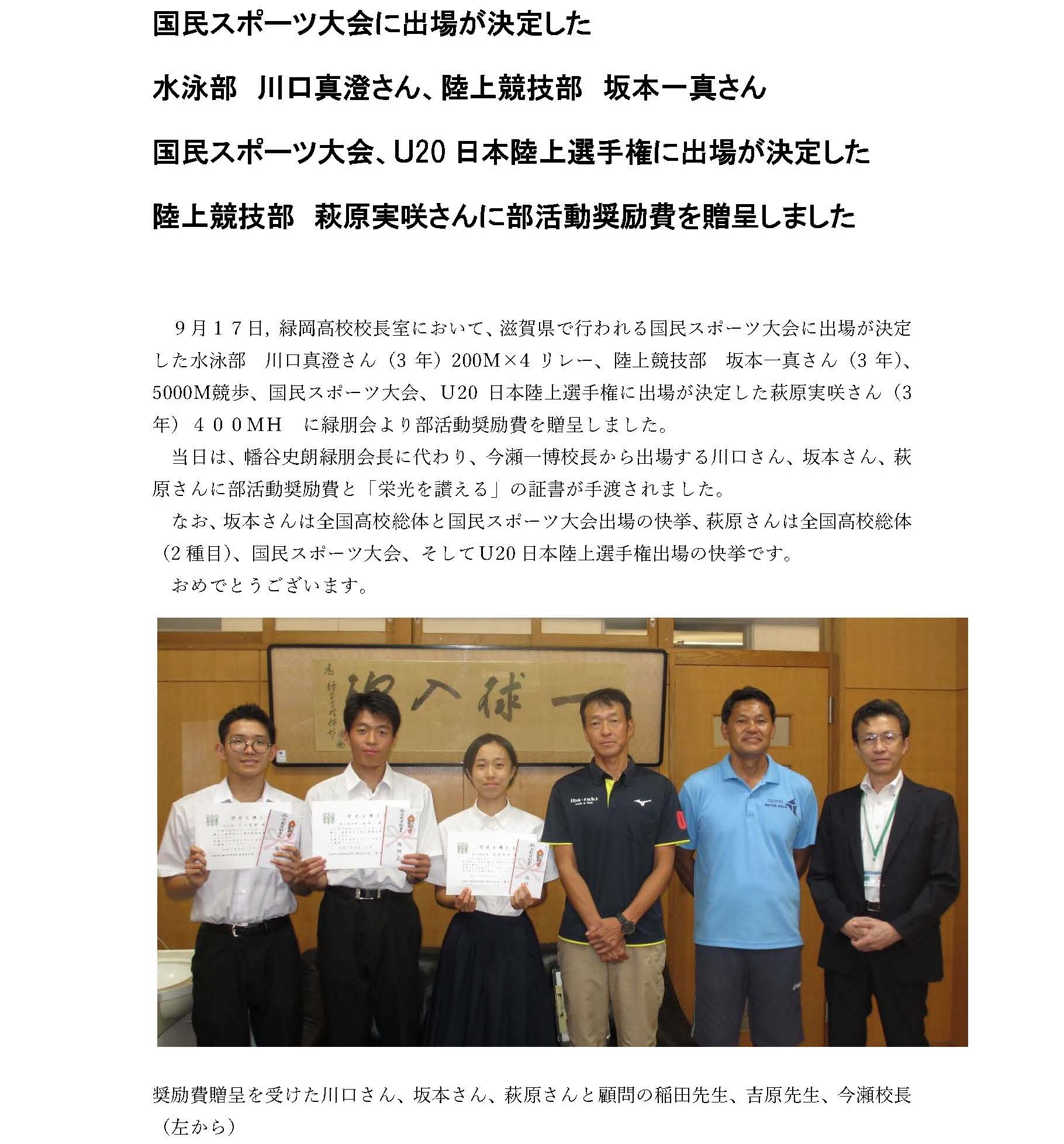 国民スポーツ大会に出場する部活動へ奨励費の贈呈